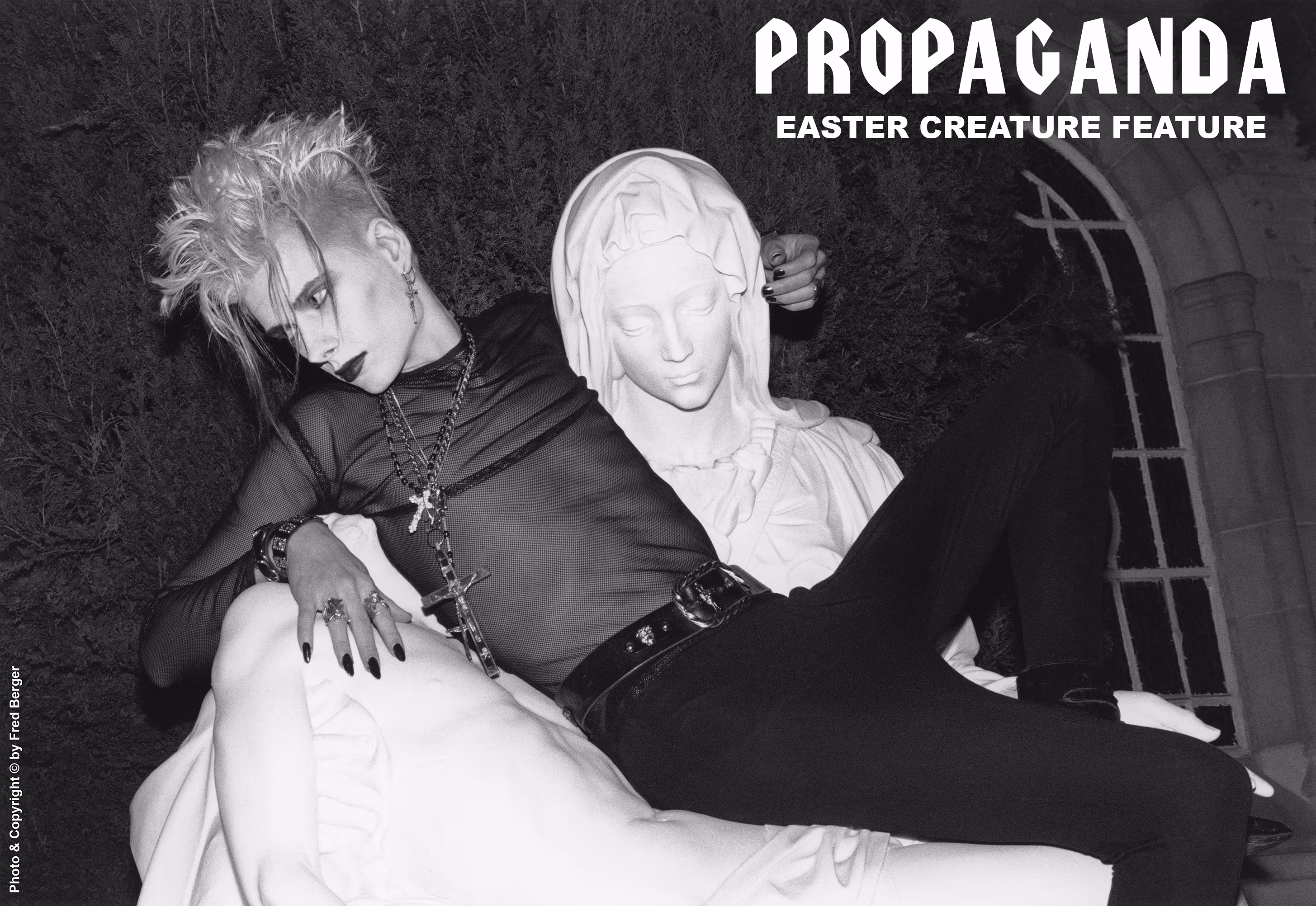 Subject: Top Propaganda model John Koviak poses with Michelangelo’s Pieta sculpture